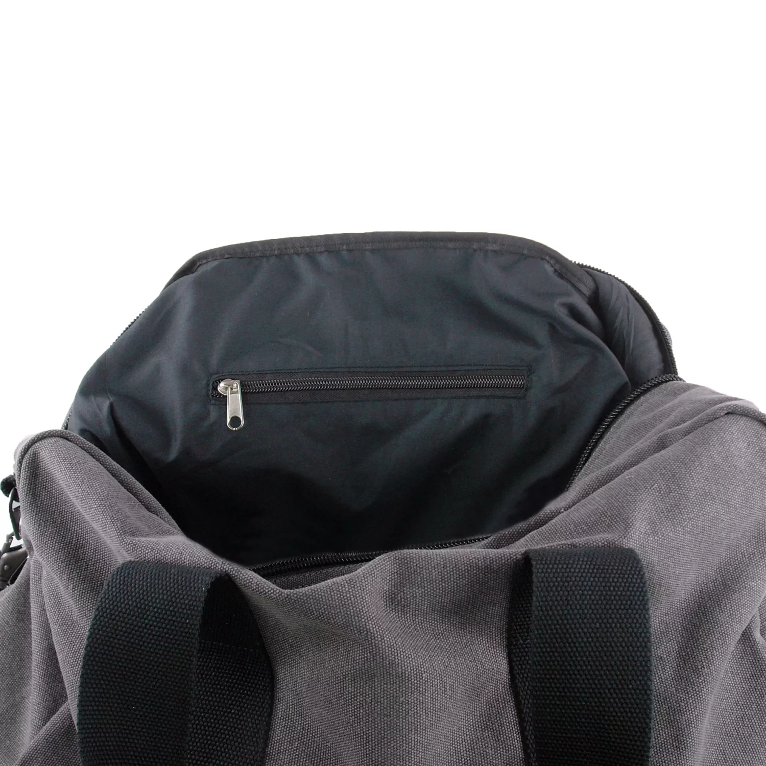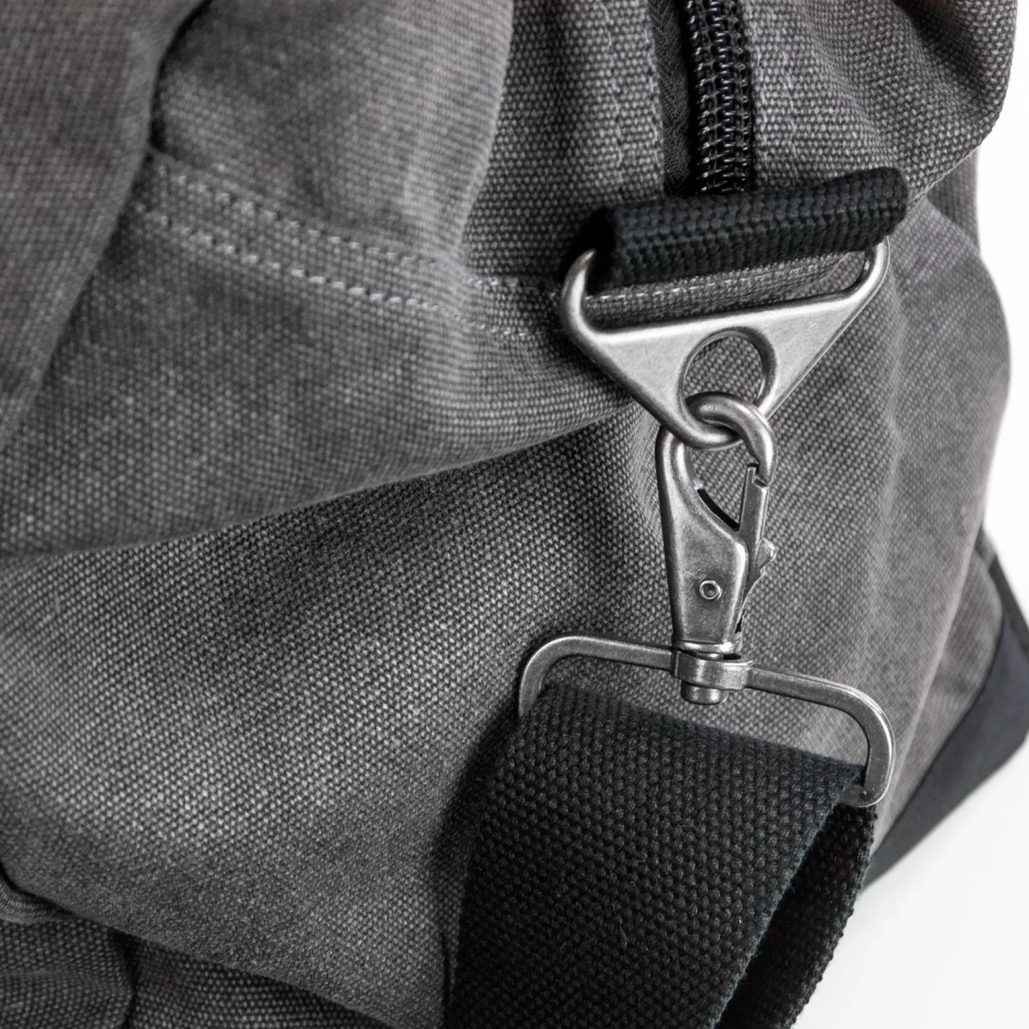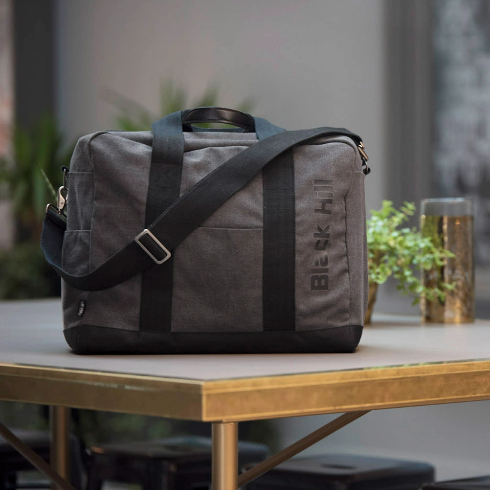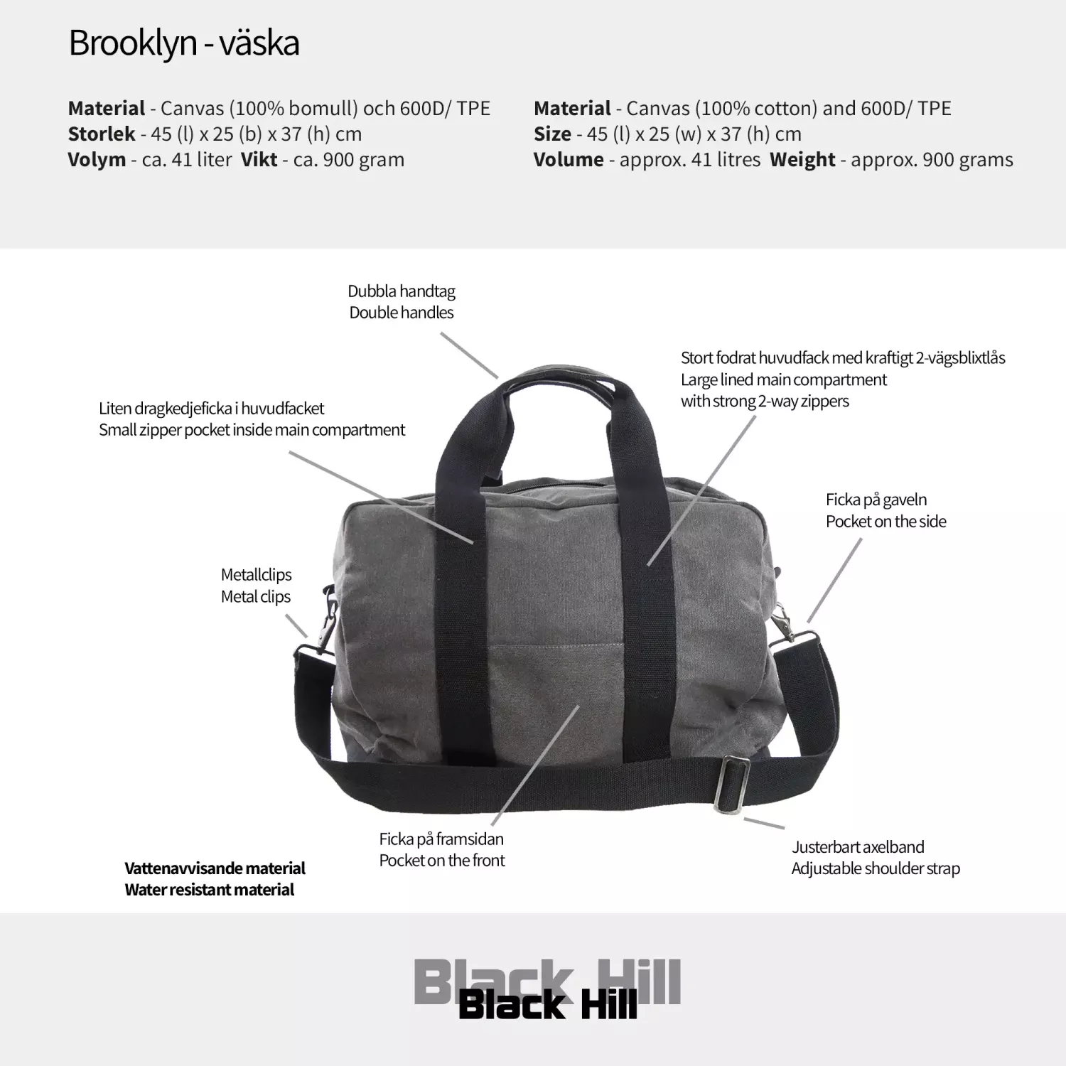 Brooklyn från Black Hill är en stor och fin väska i kraftig canvas, den passar perfekt för både sport, weekendresan och fritiden. Väskan har en värdeficka, samt ett fint tygfoder på insidan och två öppna fickor på utsidan. Väskan har breda remmar på det avtagbara axelbandet med metallspännen och metallclips. Väskan har även starka fina bärhandtag med detaljer i PU-läder för extra komfort. Väskan är i mörkgrå färg och har svart botten i 600D polyester. En mycket rymlig, mjuk och följsam väska med många användningsområden.