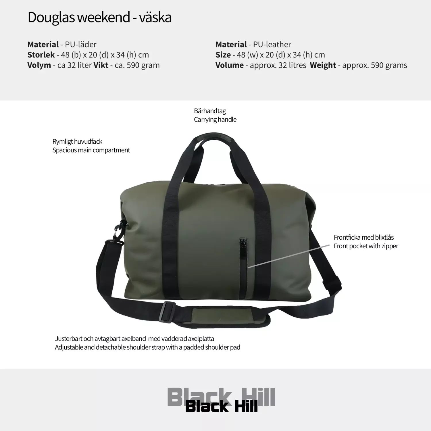 Väska från Black Hill i stilren design - perfekt för resa eller träning. Väskan Douglas Weekend är tillverkad i PU-läder med rymligt huvudfakck och är vattentålig.