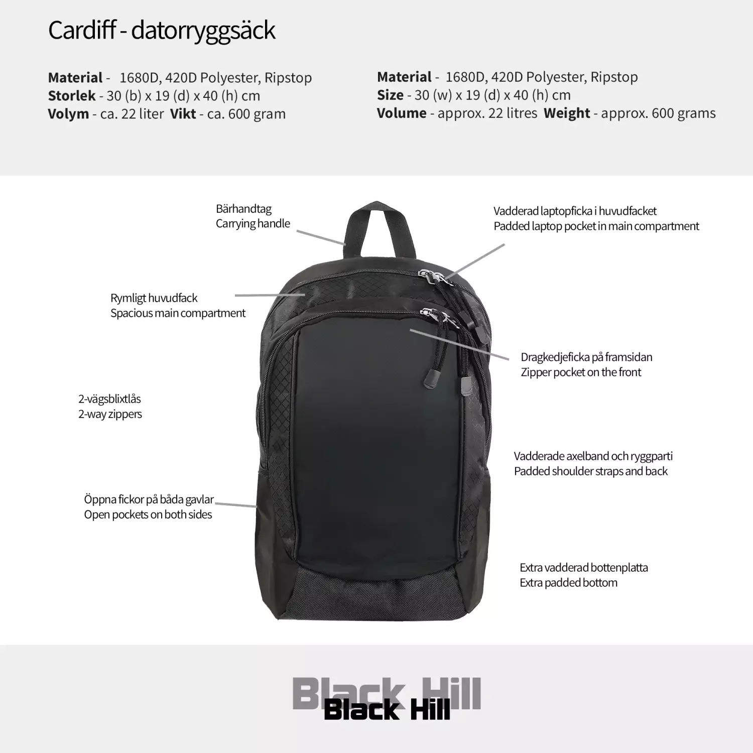Cardiff is a nice very nice and affordable computerbackpack from Black Hill with a padded laptop pocket in main compartment. Perfect for the daily use, either if it is for the work or leisure use. The backpack have a extra thick bottom so that it easily can stand on its own.