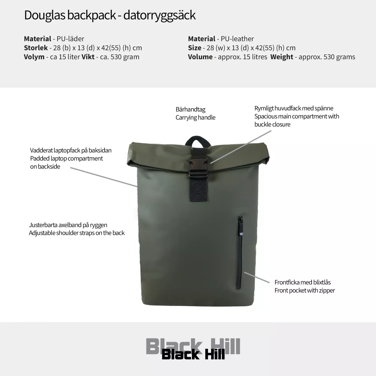 Backpack from Black Hill in nice design. Douglas backpack is made in PU-leather, a water resistant material. Douglas backpack is equipped with a padded laptop compartment on the back of the backpack.