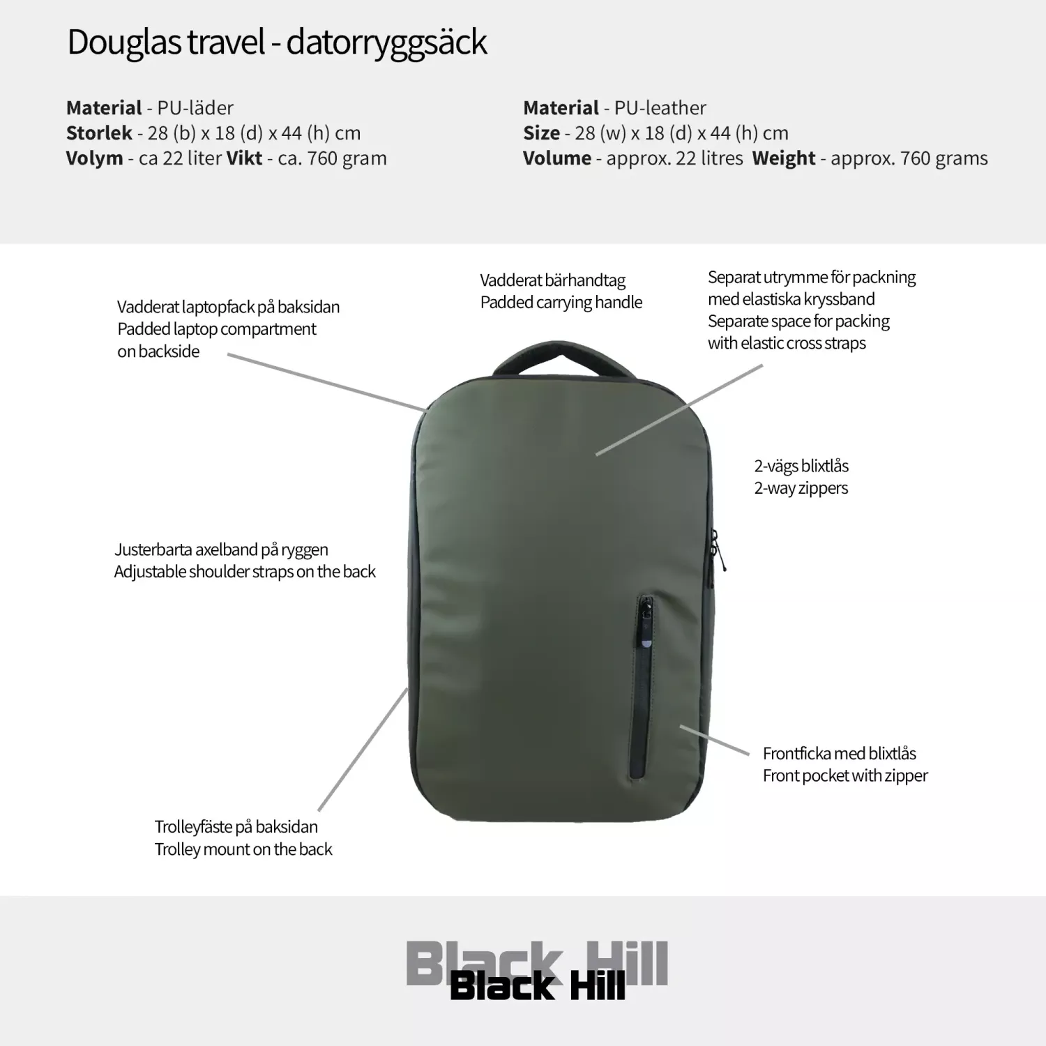 Backpack from Black Hill with a nice look. The Douglas Travel backpack is made of PU leather and is water resistant. Douglas Travel is equipped with a padded laptop compartment on the back of the backpack and a travel compartment on the front. Perfect for the business trip!