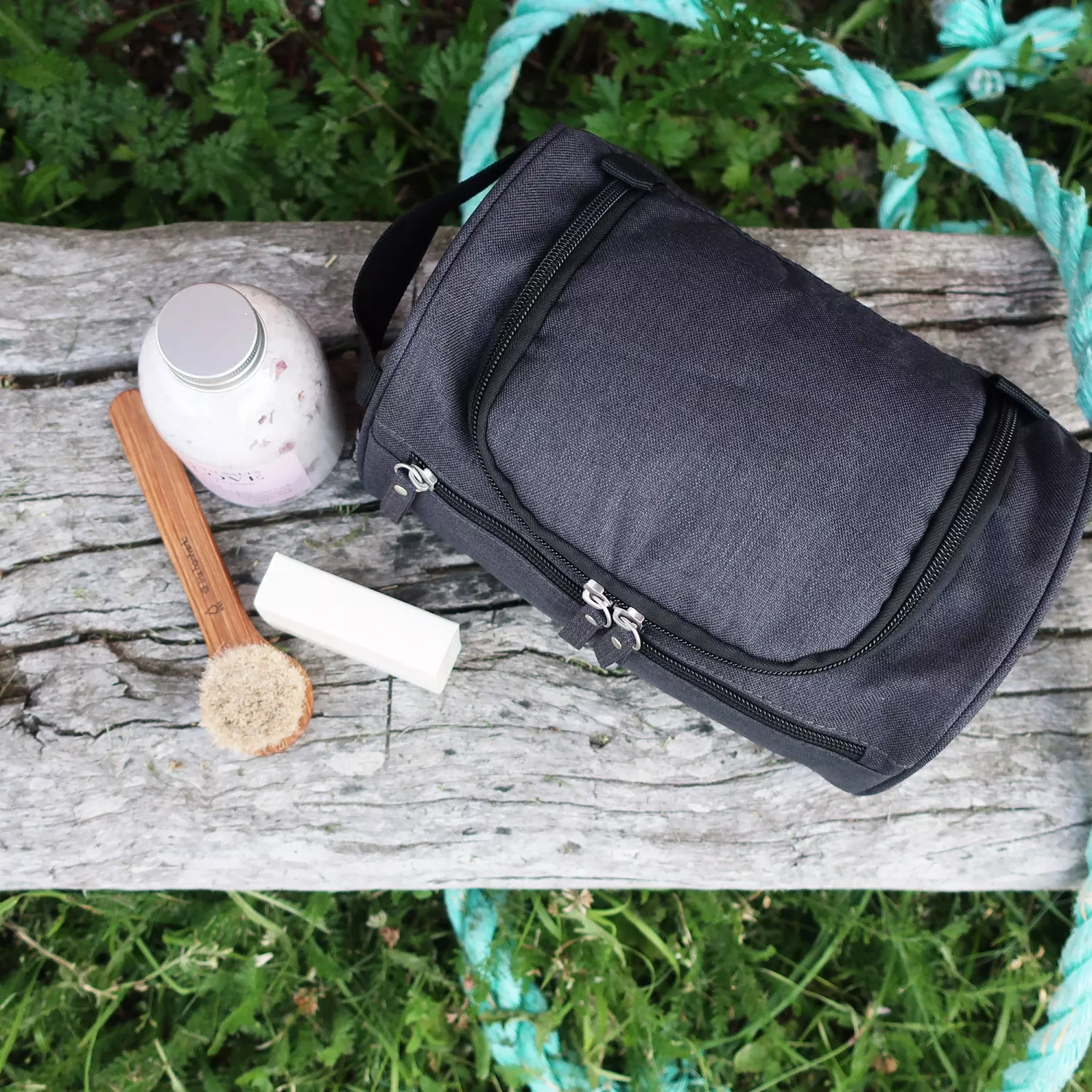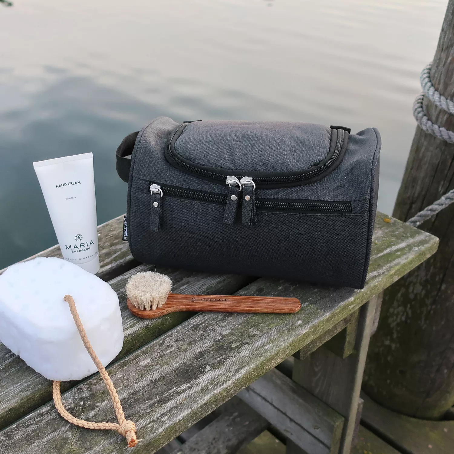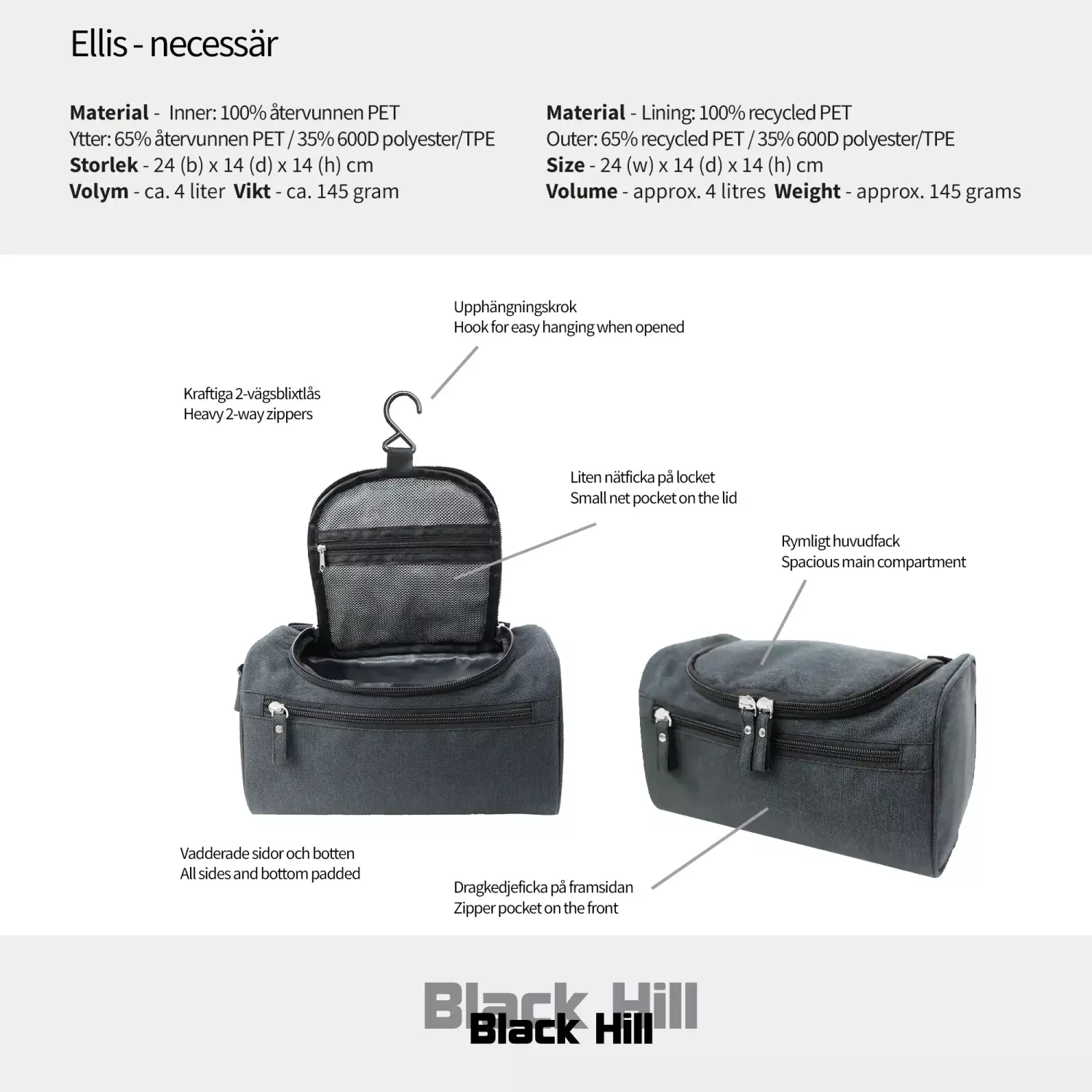 Ellis is a toilet bag with a hanging hook from Black Hill. The textile in both main material and lining is made of recycled PET bottles.