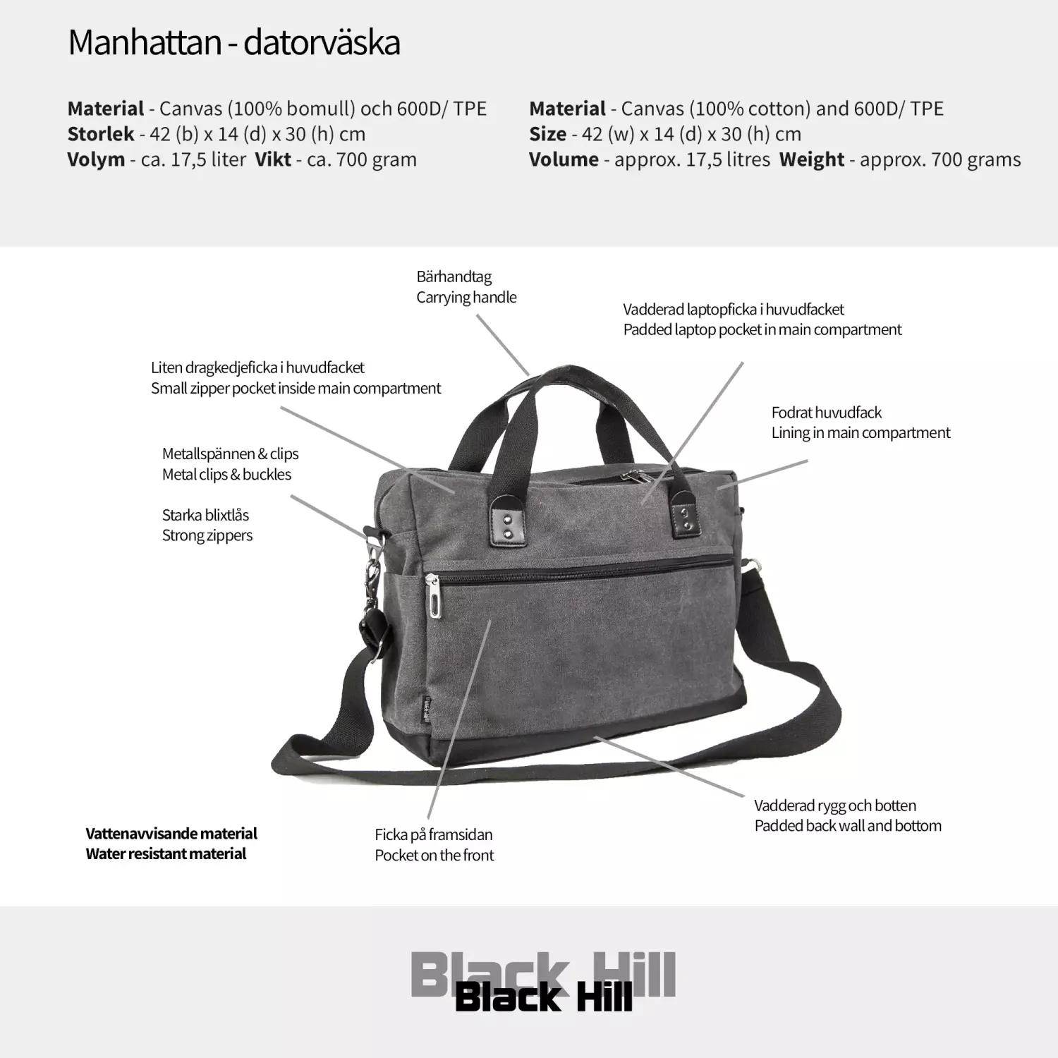 Computer bag Manhattan is a nice shoulder bag of strong, high quality cotton canvas material and nice PU-leather details. It has spacious pockets and smart storage possibilities. The back and bottom of bag is fully padded and in main compartment you find the padded laptop pocket. Bag Manhattan can be carried as shoulder bag or briefcase, so it is very easy to bring along. Manhattan, really high quality with an exclusive look for a very good price!