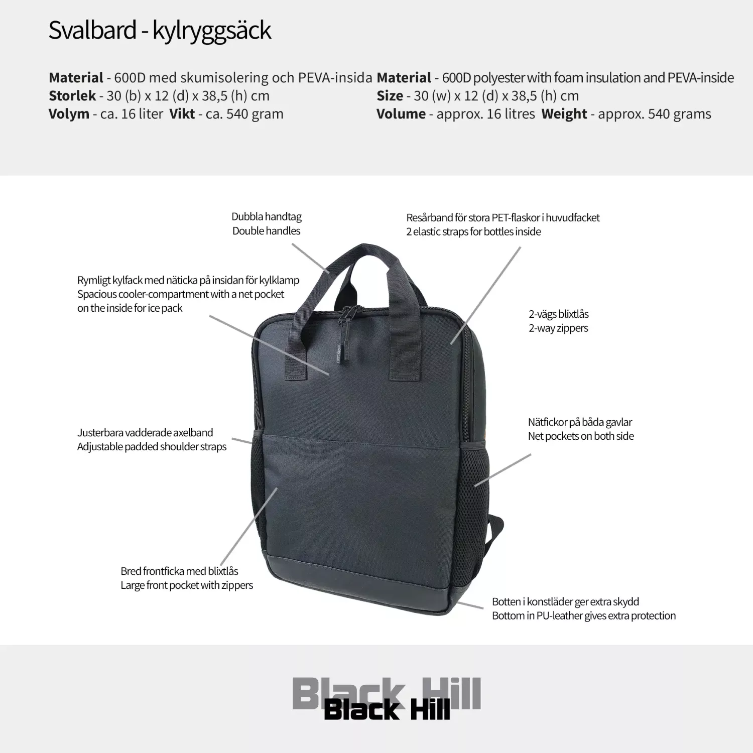 Cooling backpack from Black Hill with plenty of space for work lunch and a day trip. Svalbard has a spacious main compartment, a wide front pocket with zipper and two mesh pockets on the sides for, for example, thermos or bottles. Size 30x12x38.5 cm and holds about 16 liters.
