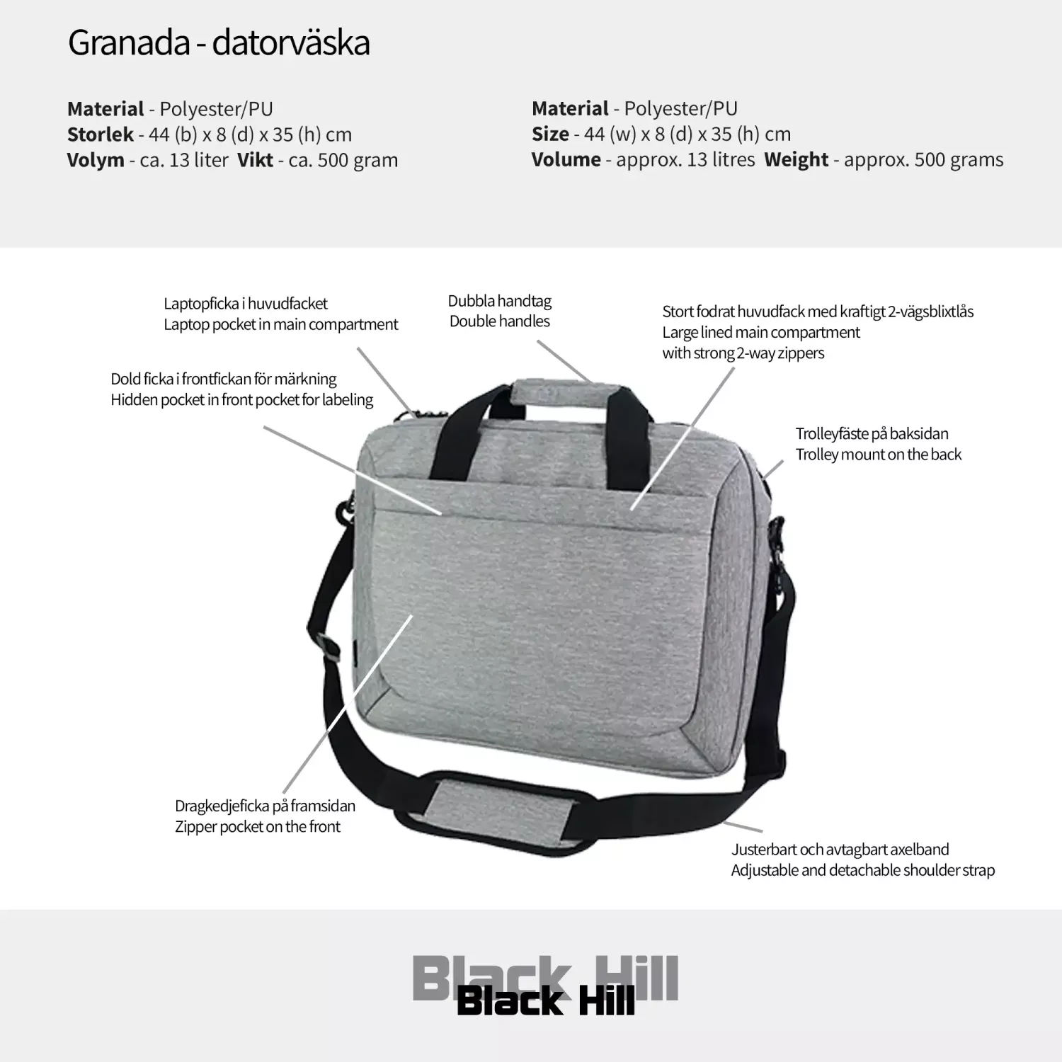 Granada är en snygg, stilren datorväska som passar såväl till skola som arbete. Väskan har plats för din laptop och arbetsmaterial som t.ex. pärm, mappar, skolböcker etc. Axelbandsplattan ser till att din väska inte glider av din axel. Är du ute och reser finns det ett trolleyfäste för att sätta fast din laptopväska på trolleyns handtag.
