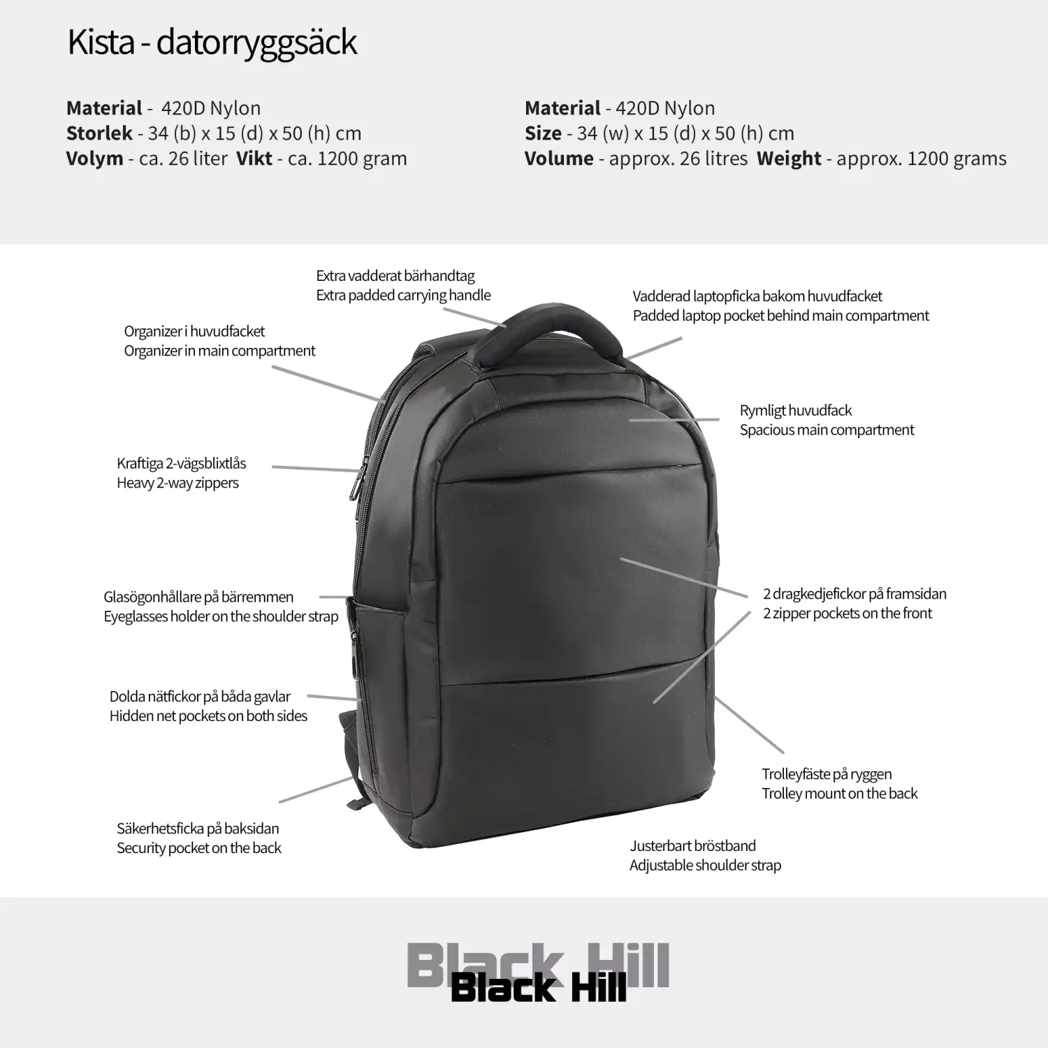 Kista är en stilren ryggsäck på cirka 25 liter. Den har vadderad laptopficka, organizer i huvudfacket och en smart dold säkerhetsficka på baksidan.