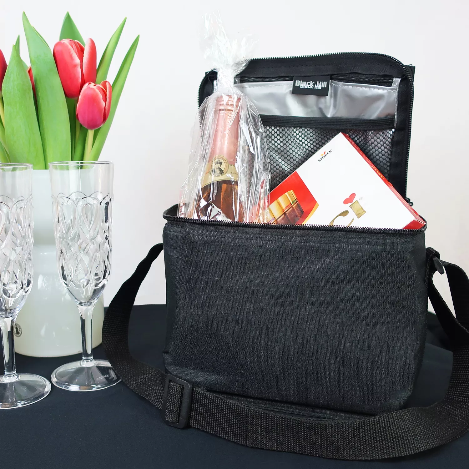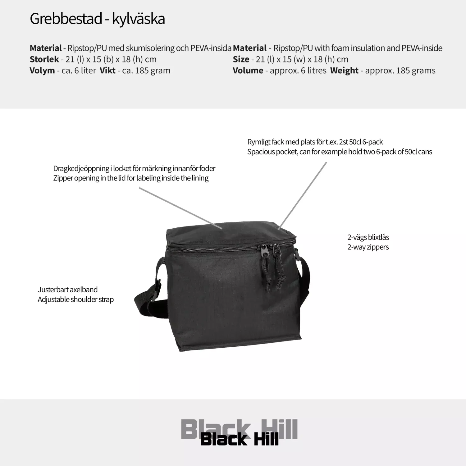 Liten og praktisk kjøleveske fra Black Hill i mykt Ripstop-materiale med plass til for eksempel lunsjboksen og litt til. Nettinglomme under lokket til kjøleelementer.