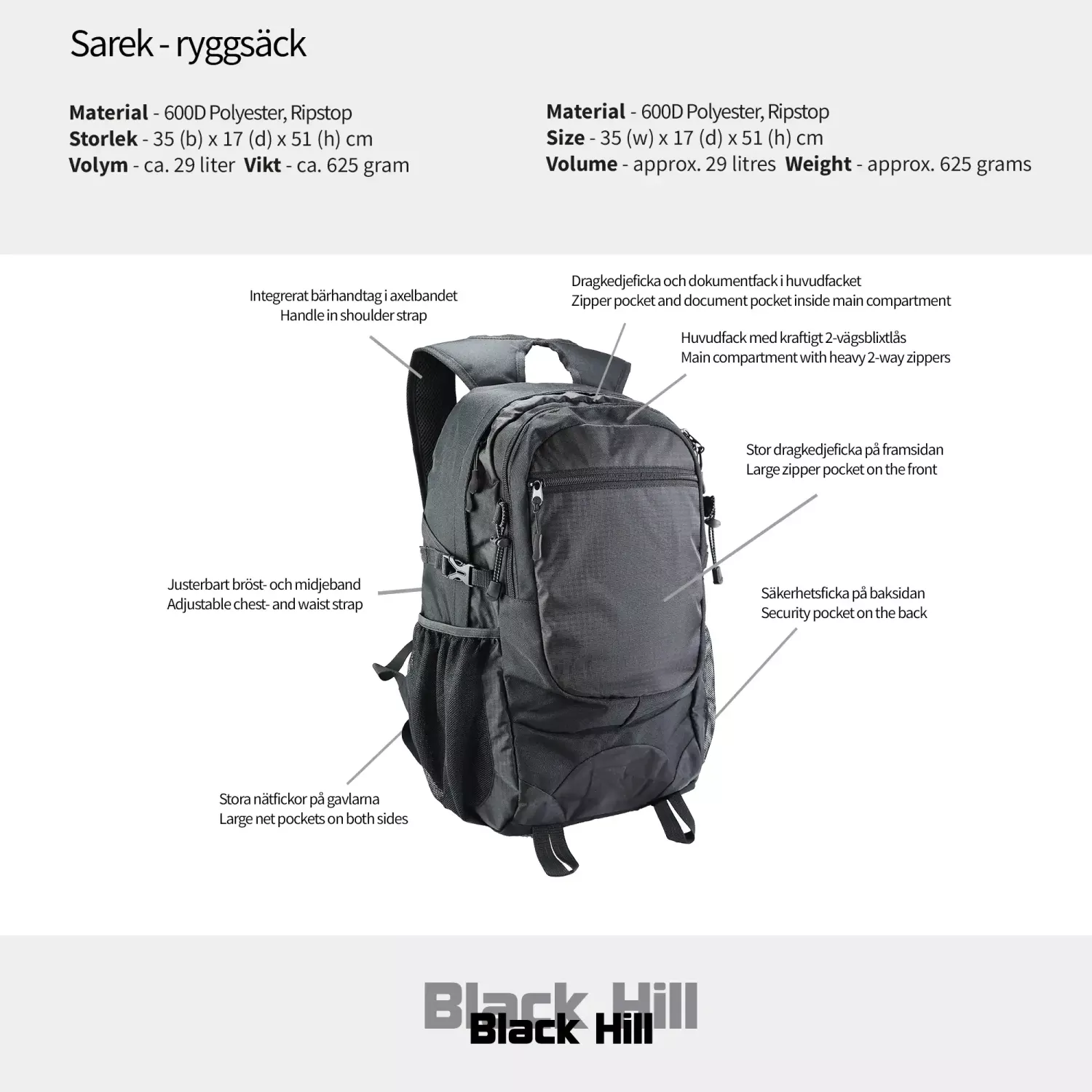 Sarek er en pen og romslig sports-/fritidsryggsekk fra Black Hill som er perfekt for eventyr! Rikelig med plass til oppakning, utstyrt med brystrem, ekstra avlastende midjerem, godt polstret ryggparti og behagelige skulderstropper. Ryggsekken har mange