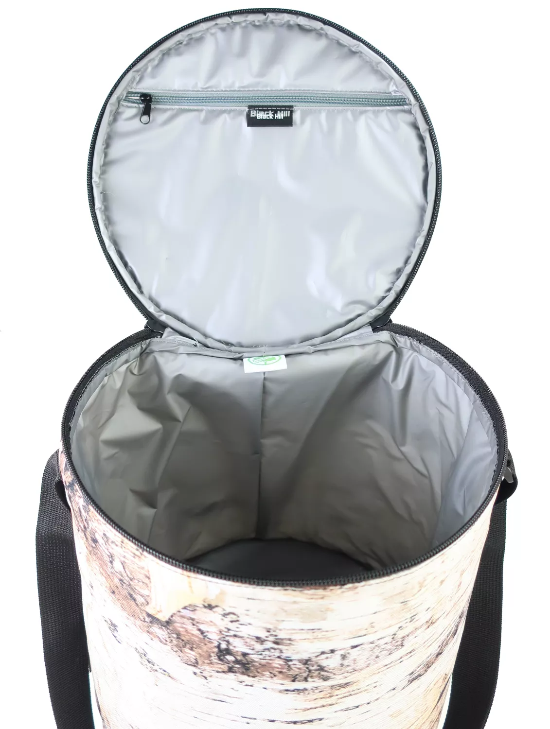 Kul sylinderformet sublimasjonskjølebag med motiv av en bjørkestubbe. Størrelse 26x26x29,5 cm og ca 14 liter.