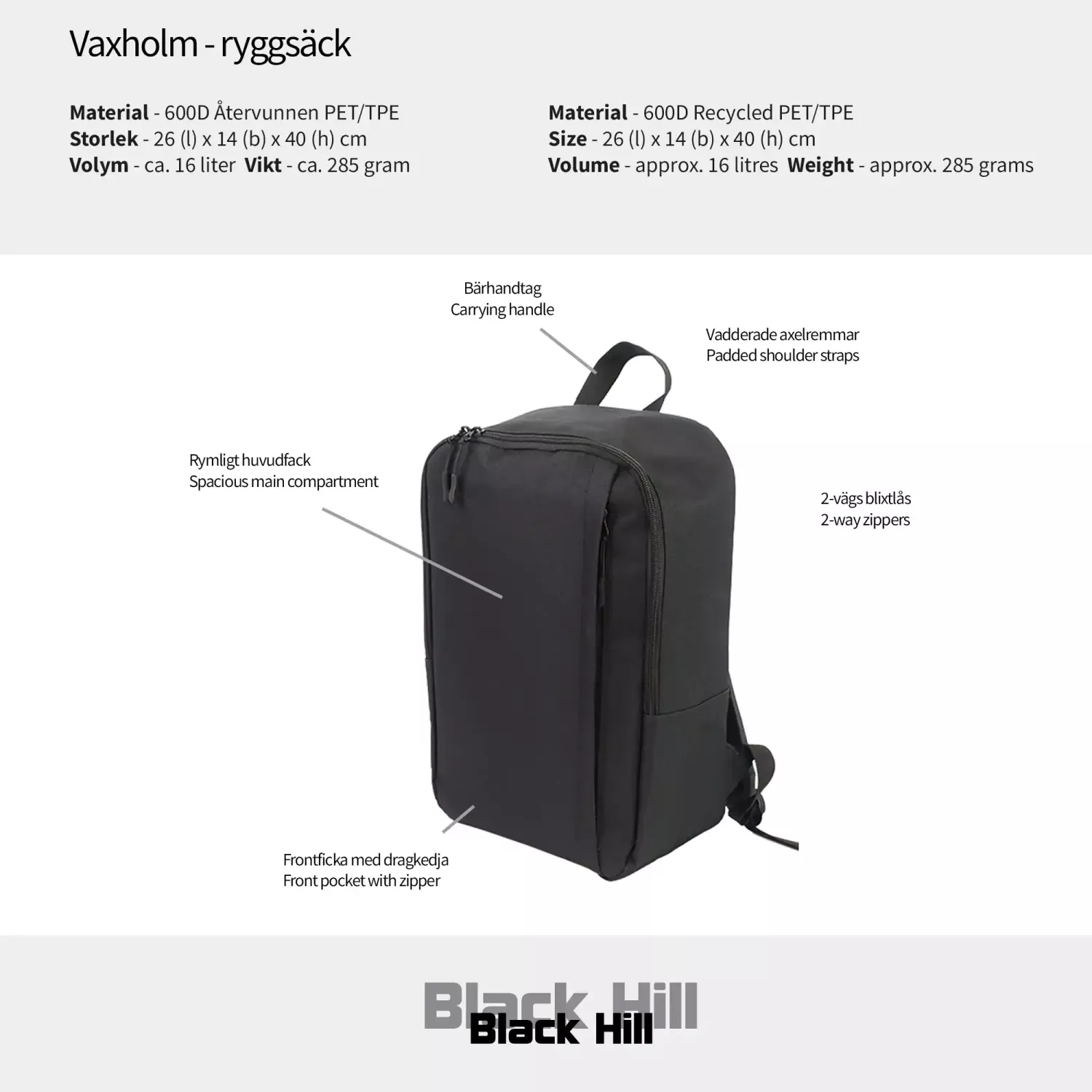 Vaxholm fra Black Hill er en enkel og stilig ryggsekk, laget av det slitesterke materialet 600D resirkulert PET / TPEf.