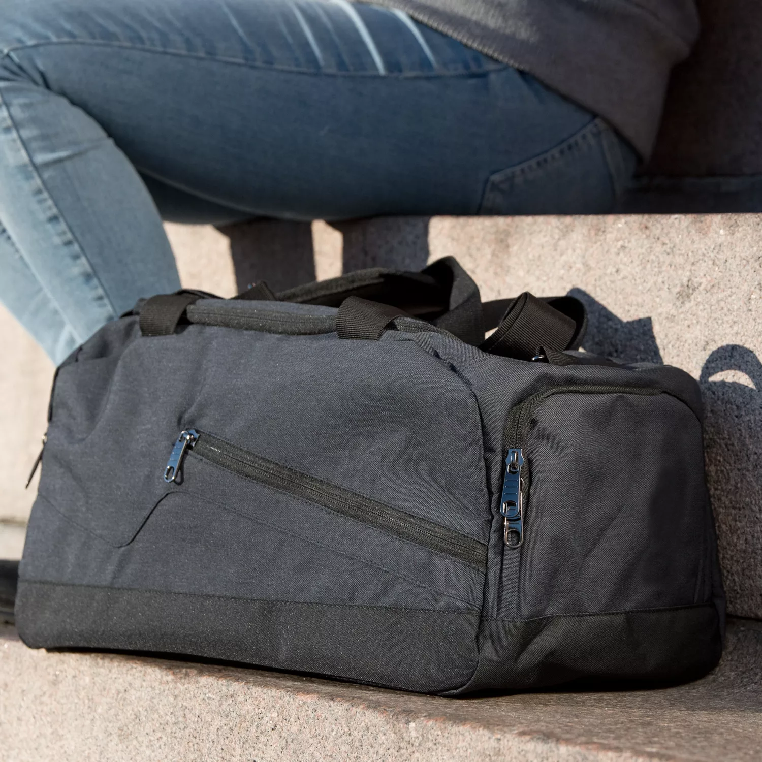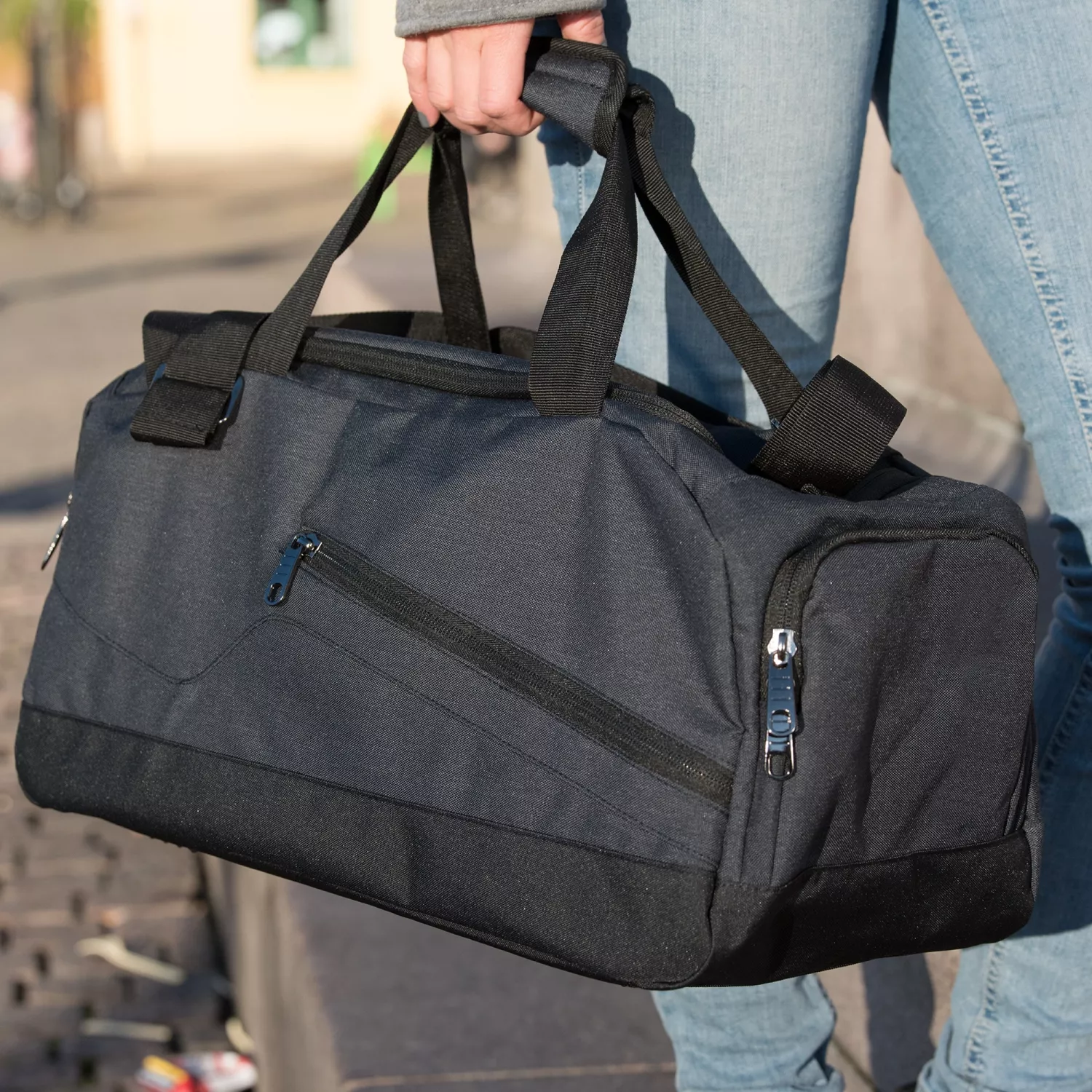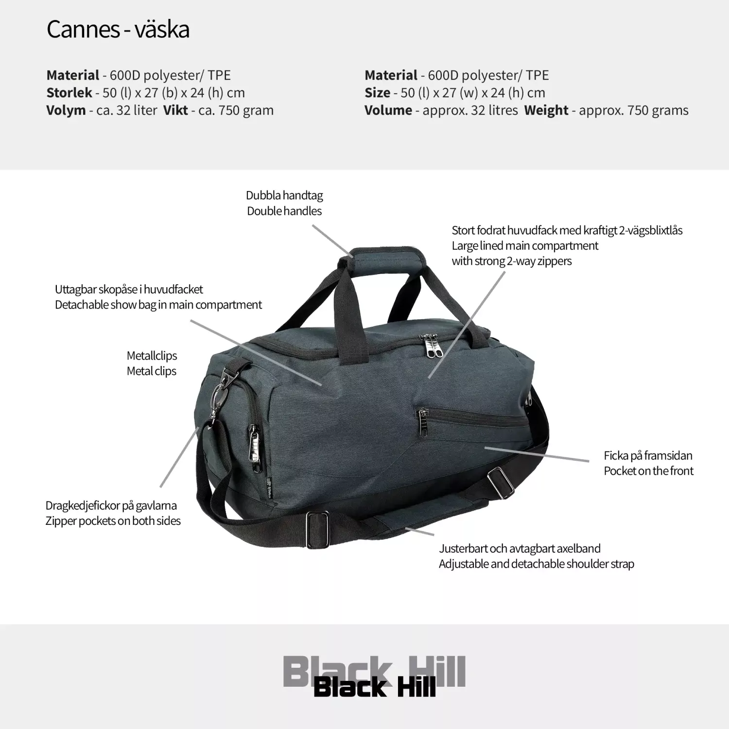 Sport/weekendväska från Black Hill i snygg design. Väska Cannes är gjord i väldigt mjukt och följsamt antracitfärgat material. Väskan rymmer cirka 32 liter och är smidig och utmärkt till träningen, gymmet eller weekendresan. Den är utrustad med sidofickor, sko-/klädpåse, bärhandtag samt justerbart och avtagbart axeband med mjuk axelplatta för extra komfort.
