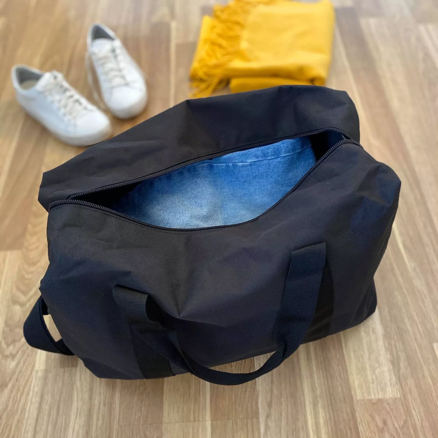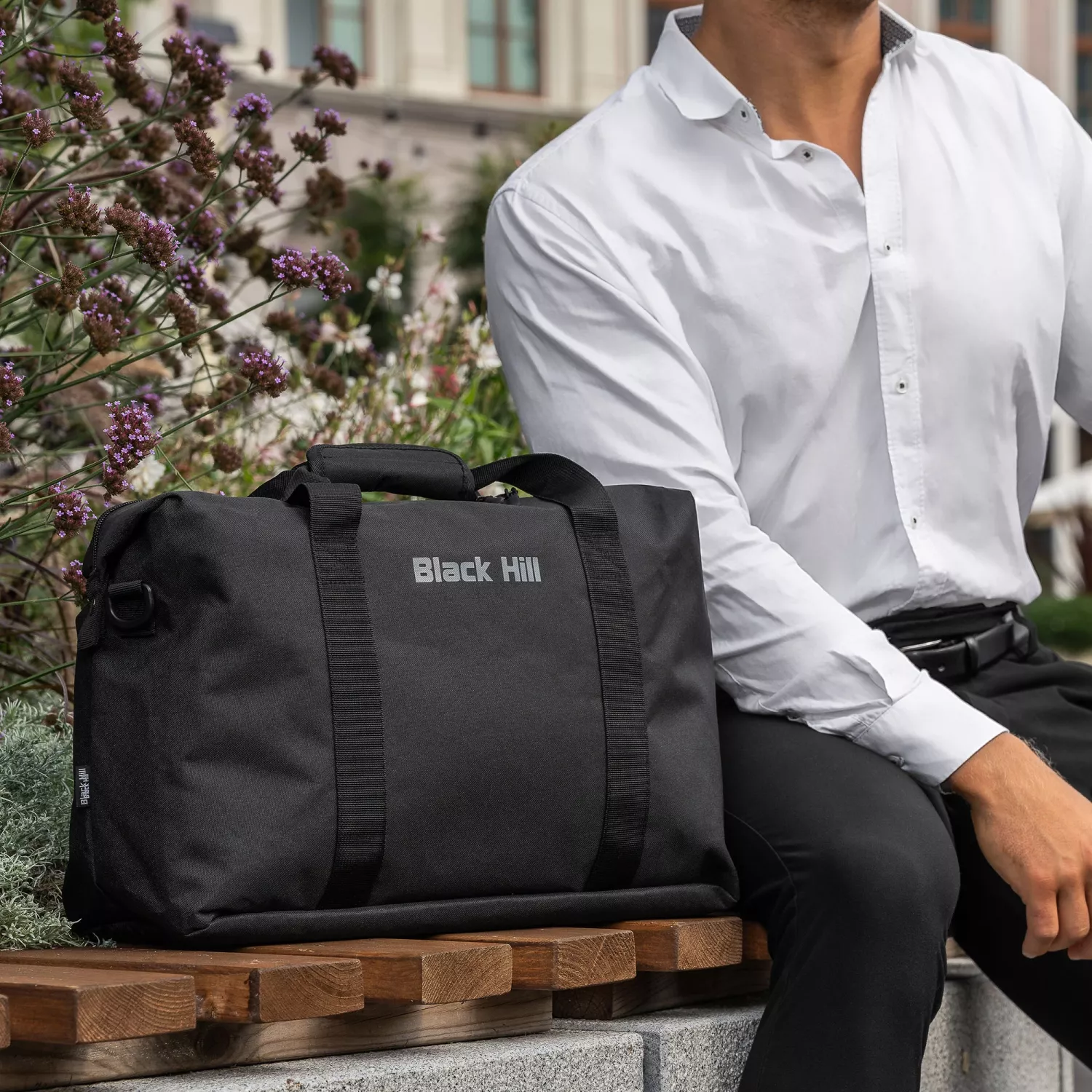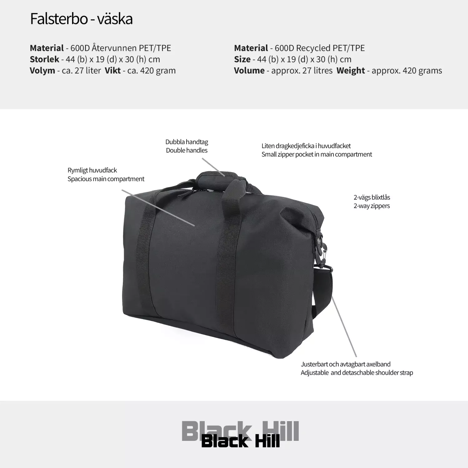 Falsterbo från Black Hill är en enkel och stilren weekendväska, tillverkad av ett slitstarkt återvunnet material: 600D återvunnen PET/TPE (RPET).