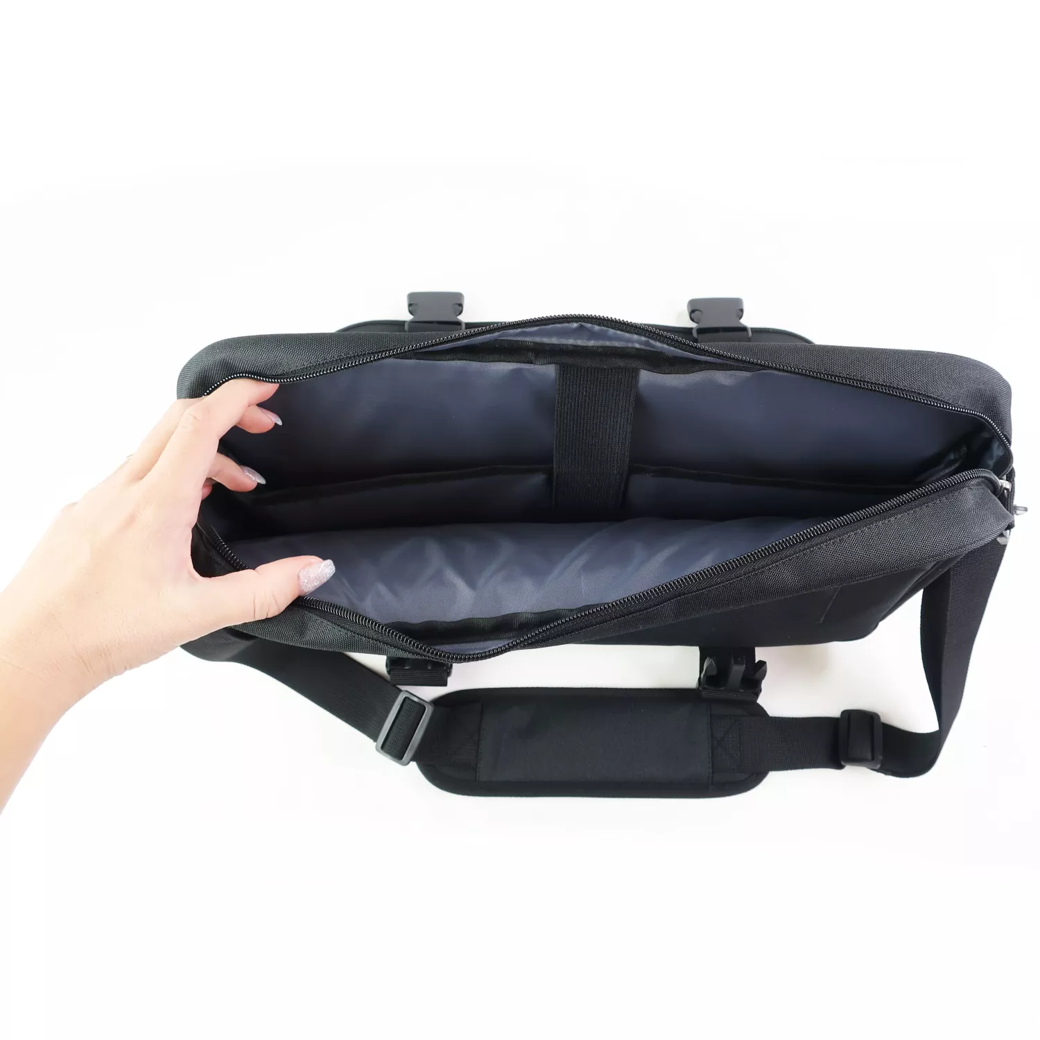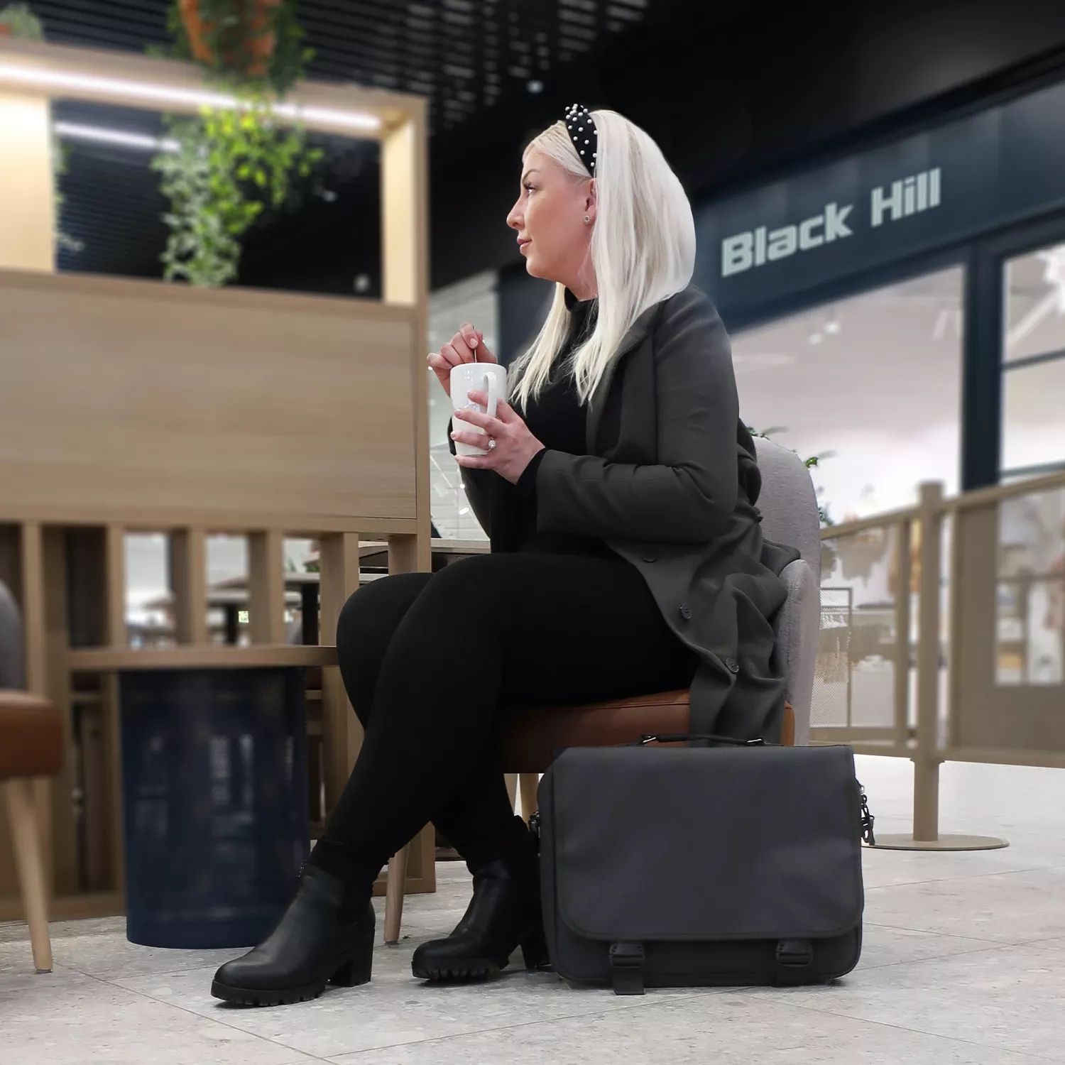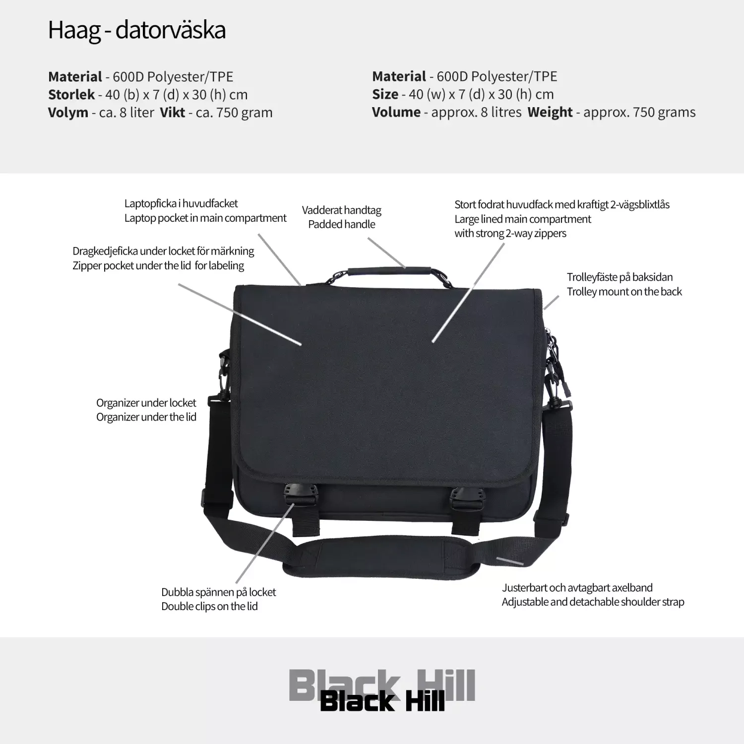 Haag är en stilren klassisk portfölj-/datorväska från Black Hill. Väskan har ett vadderat datorfack, dragkedjeficka i locket för lättare märkning samt en organizer.