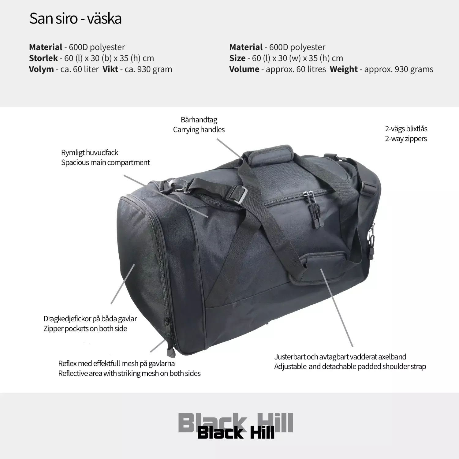 Stor sport och fritidsväska från Black Hill, i San Siro får du plats med allt du kan tänkas vilja ha med dig. San Siro rymmer runt 60 liter och har stort huvudfack och två gavelfickor. Väskan har även greppvänliga bärhandtag med snygga detaljer, axelband samt mesh-detaljer på sidorna med effektfull reflex.