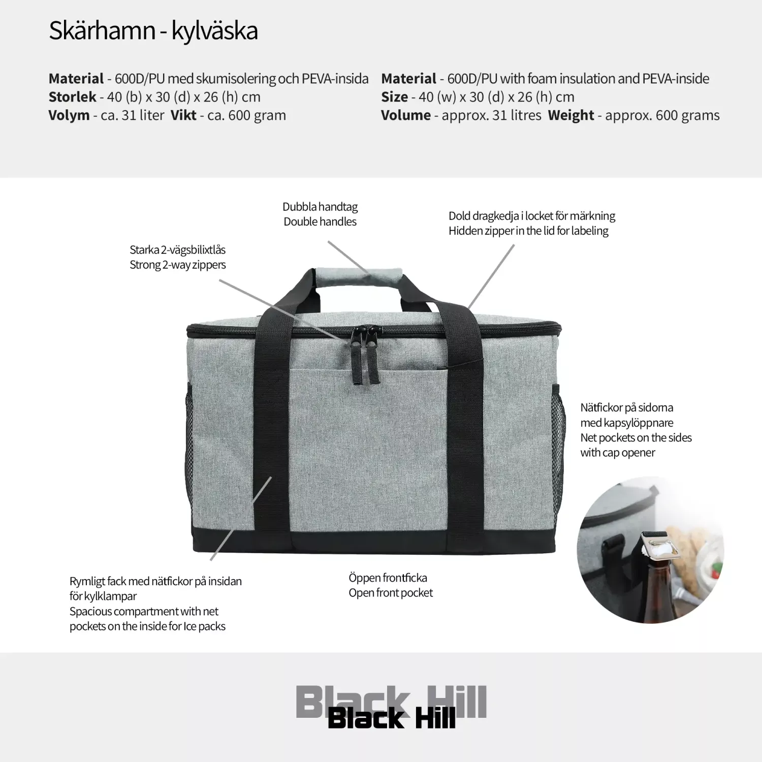 Skärhamn från Black Hill är en extra stor kylväska som passar hela familjen. Den har ett stort kylfack med nätfickor för kylklampar inuti och en öppen ficka på framsidan. Skumisolerad PEVA-vaddering på insidan som bevarar kylan länge. Lätt att torka ur.