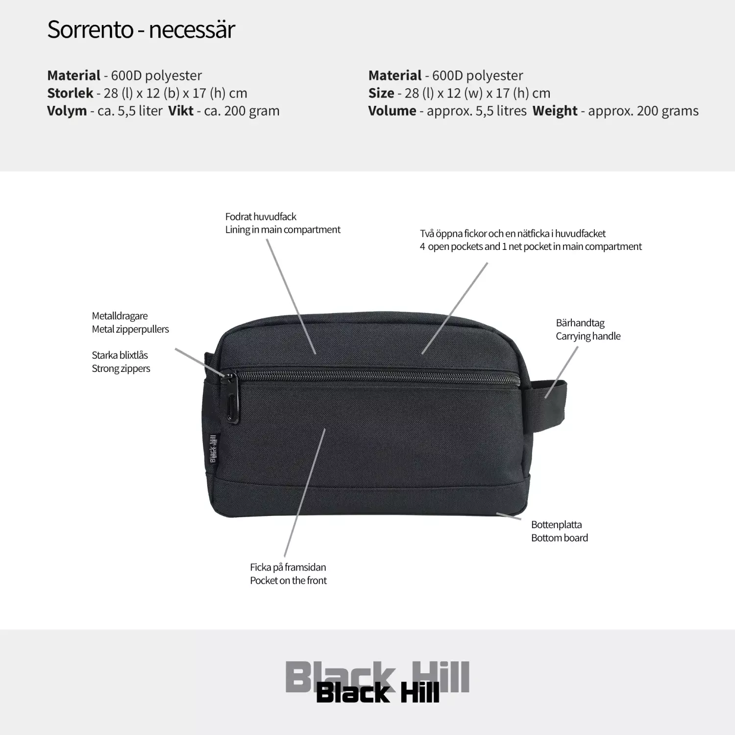 Rejäl necessär från Black Hill. Sorrento har en dragkedjeficka på framsidan och foder på insidan. Necessären har ett bärhandtag och 2-vägsblixtlås så den är lätt att hantera. Du får plats med det mesta du kan behöva ha med i det stora huvudfacket. Matchar bland annat väska Bologna och ryggsäck Torino.